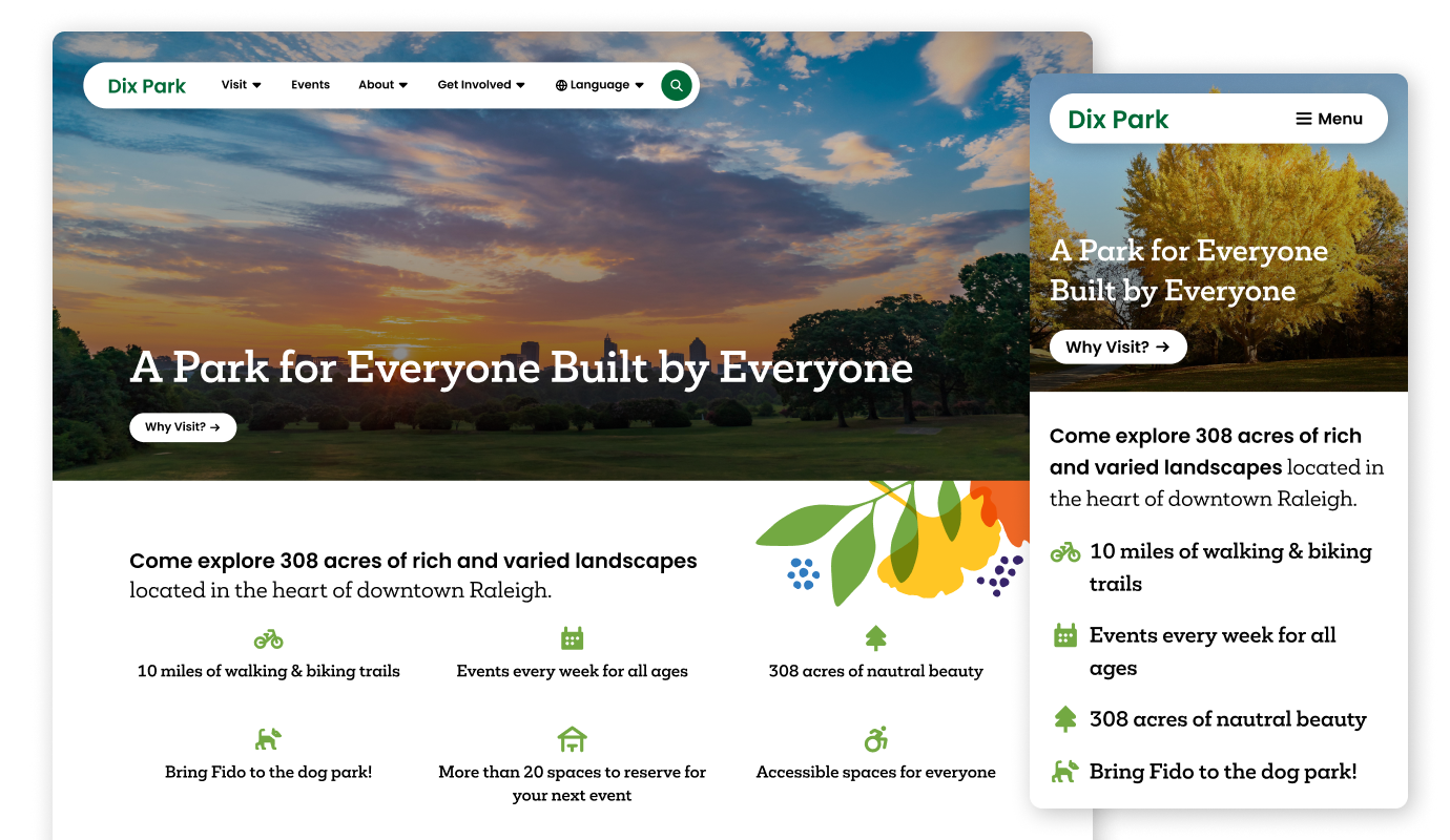 Situated less than two miles from downtown Raleigh, Dix Park isn't just any green space. This 308-acre park serves as the cultural heart of the city. However, the park's website wasn't keeping pace with its evolving role in the community. Not only did visitors struggle to quickly access essential information about park offerings and events, but the site's design also didn't capture the park's vibrant community life.